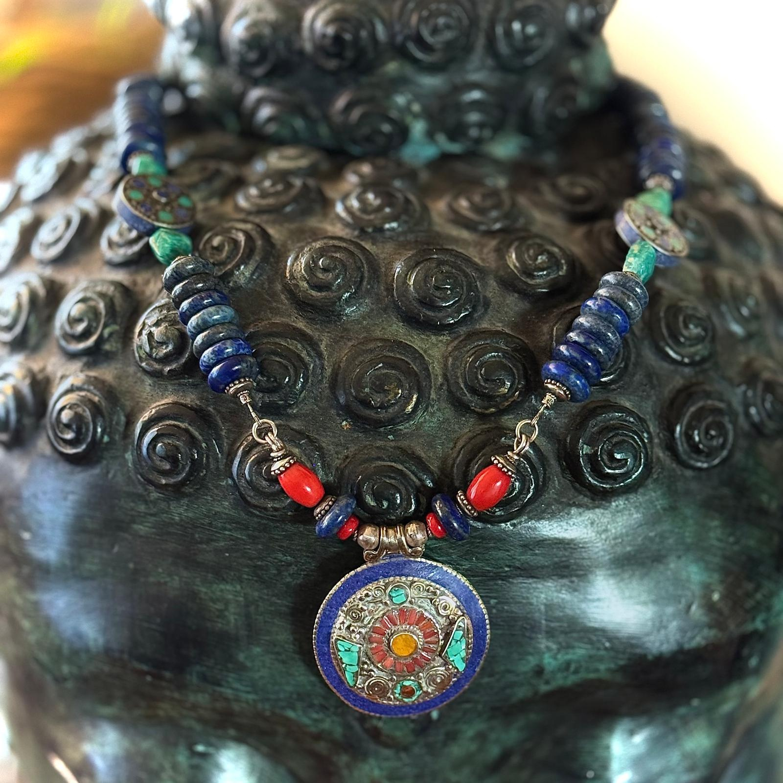 Pendant: vintage sterling silver Tibetan Nepali Pendant hand made with turquoise, coral, and lapis. Vintage retro Nepal handmade inlay beads. Necklace has lapis lazuli disc beads, turquoise faceted rondelle beads, Peruvian oval faceted nuggets beads, sterling silver beads and sterling silver endcaps. The length of the necklace is 30 inches.